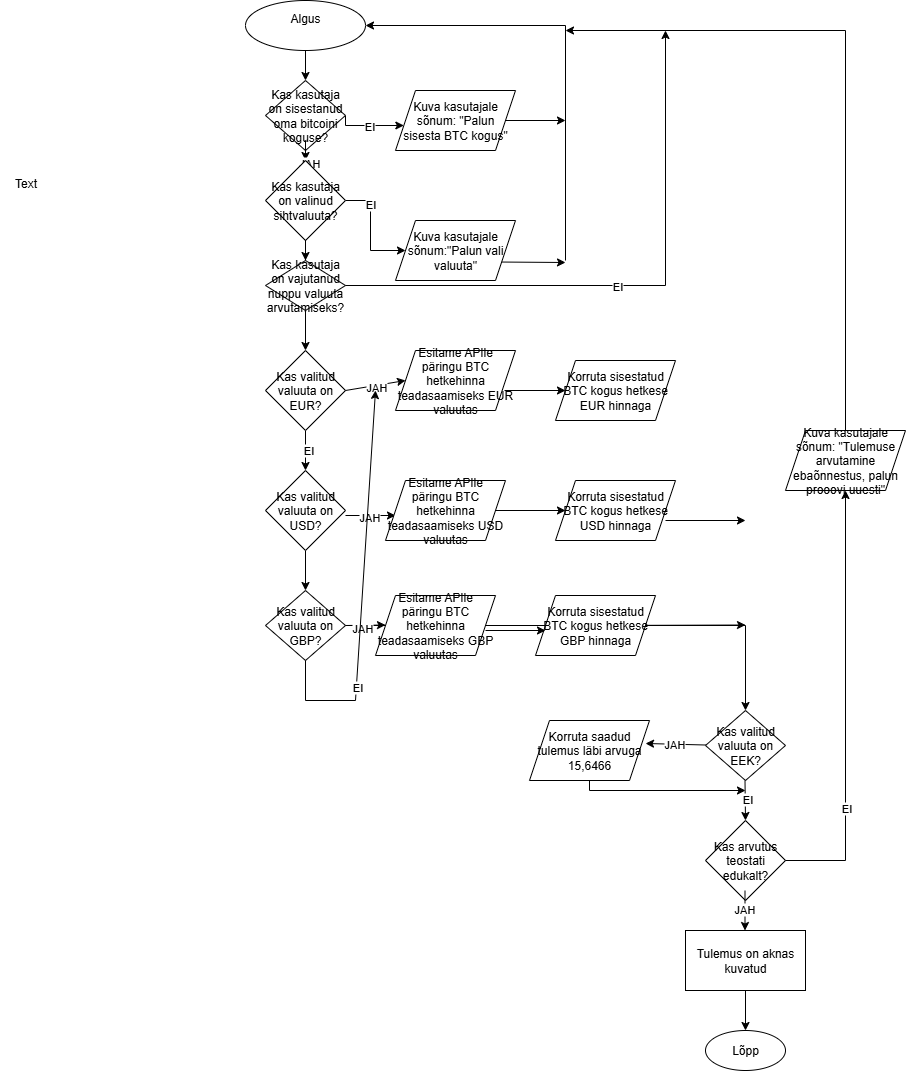 Esiteks kontrollib programm kas kõik vajalikud väljad (bitcoini kogus ja sihtvaluuta) on täidetud. Probleemi korral